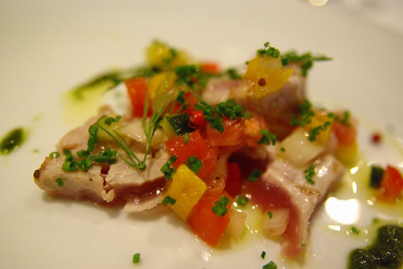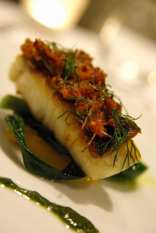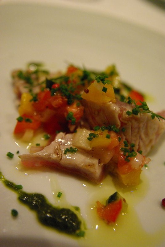 そして魚料理は、スズキのカリカリポワレに辛いトマトソースを添えて