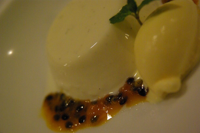 デザートはミルクプリンにパッションフルーツソース、バニラアイス添え。