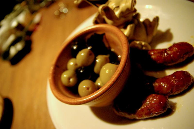 オリーブとソーセージ。ソーセージは小さいと思いきや