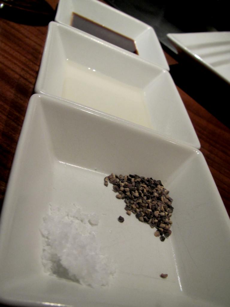 しょうゆ、酢、岩塩とこしょうがはいったお皿が配られ